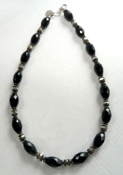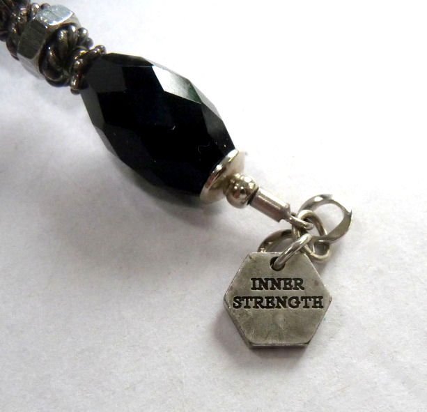 Bold and beautiful, this necklace created by Shirley Myers of Nutty Necklace is made of jet black beads and polished stainless nuts to give it a truly elegant appearance. No one would ever guess you were wearing hardware! What a great way to recycle ... the clasp has a small hanging charm which reads "Inner Strength". Each of Shirley's jewelry pieces comes with her own trademarked poem ... click on the photos to read it :-) Although Shirley's business is still going strong, this particular design is no longer available so it is truly one-of-a-kind!