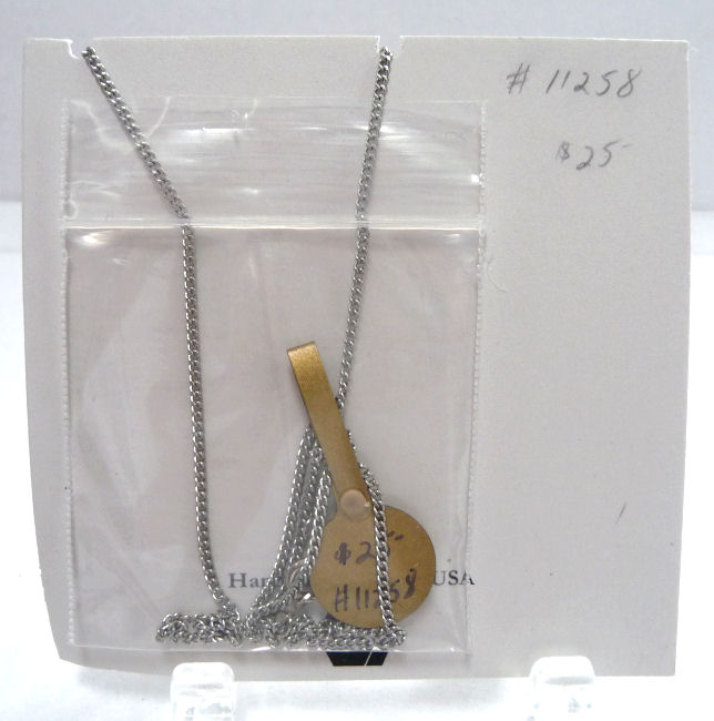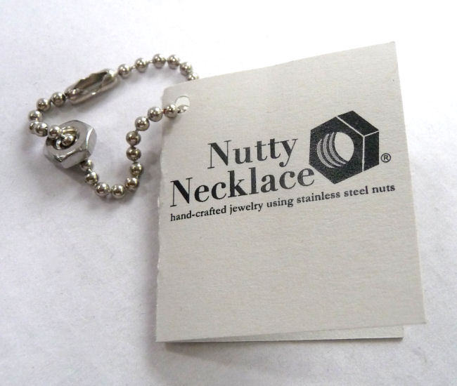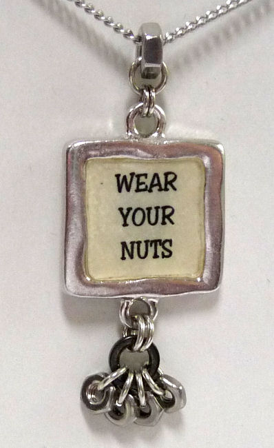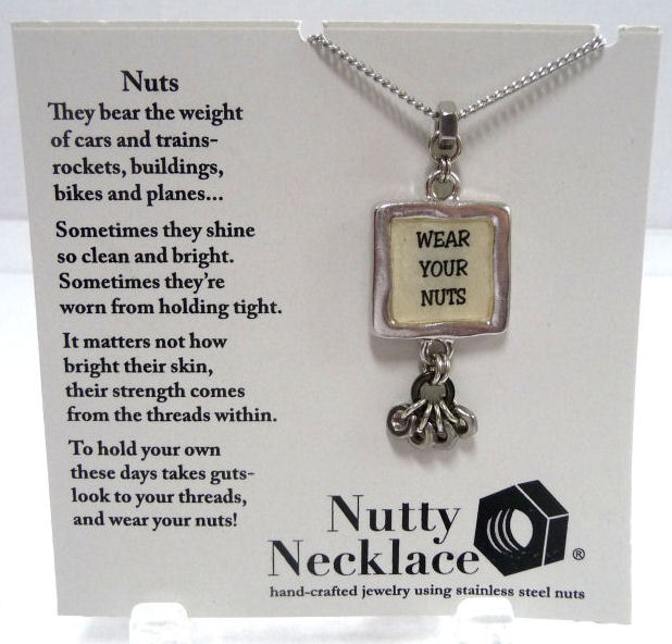 This cleverly designed necklace created by Shirley Myers of Nutty Necklace is made of polished stainless nuts suspended from a pendant which reads "Wear Your Nuts". No one would ever guess you were wearing hardware! What a great way to recycle ... the 18" chain is also stainless. Comes mounted on a card featuring Shirley's own trademarked poem ... click on the photos to read it :-) Although Shirley's business is still going strong, this particular design is no longer available so it is truly one-of-a-kind!