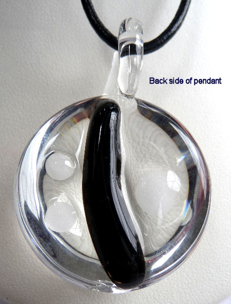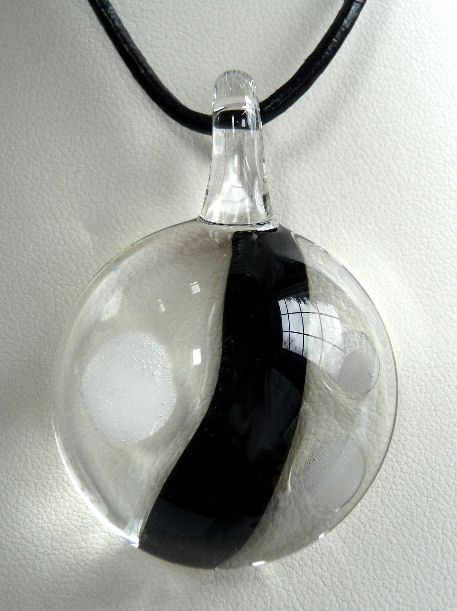 This stunning modern design glass pendant was made by Victor Meyer of Sculptures in Glass. The design is a black stripe in the center with 3 white dots around it. The shape is a half circle which is flat on the back with the exception of the colored glass. When viewed from the front it has an almost 3-dimensional effect. The pendant measures 1-1/4" diameter x 3/4" deep and comes mounted on a leather cord.