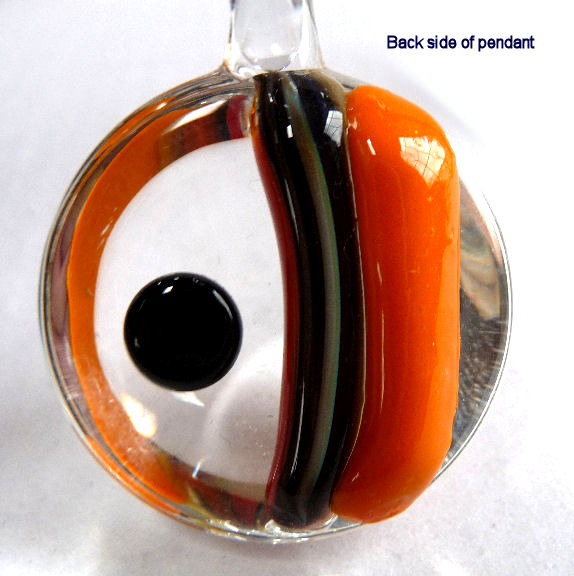 This stunning modern design glass pendant was made by Victor Meyer of Sculptures in Glass. The design is a black dot on the right and earthtone stripes on the left half. The shape is a half circle which is flat on the back with the exception of the colored glass. When viewed from the front it has an almost 3-dimensional effect. The pendant measures 1-1/4" diameter x 3/4" deep and comes mounted on a leather cord.