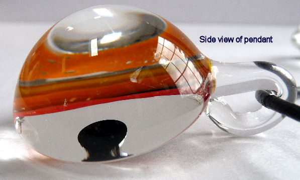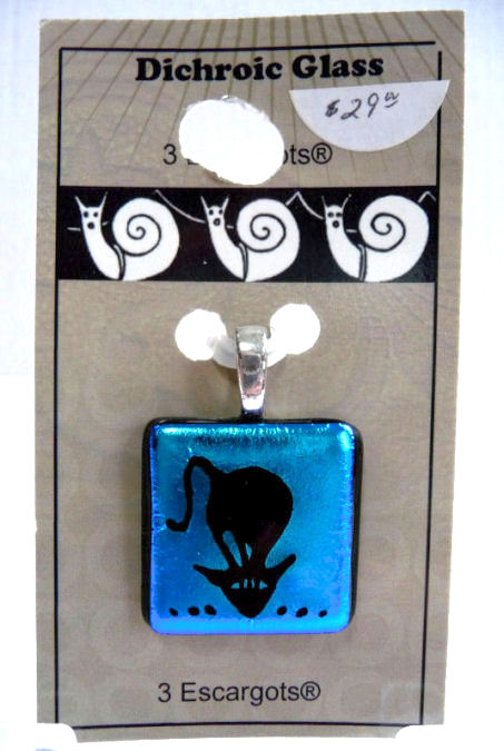 This stunning pendant was made by husband and wife team James and Nathalie Stickland. Each creation is unique ... the glass from 3 Escargots is cut and layered to produce the optimum aesthetic effect. Pieces are heated in a kiln, cooled slowly, then ground and finally fire-polished. The colors are spectacular, and they change with every movement of the finished piece.
