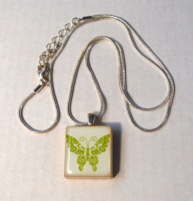 This lovely lime green butterfly pendant was handmade on a recycled Scrabble tile by Stef and Mark of HomeStudio Arts. These were a huge hit in our store and we sold a ton of them. What we had left has been packed away since 2010 and now is being offered ... we only have one of this design left ... photo of back of this necklace is the letter shown. We have included a silverplated adjustable chain.