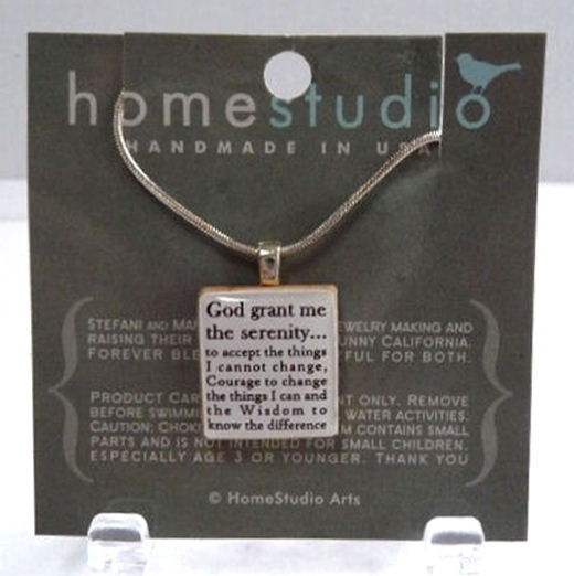 This wonderful awareness pendant bears the Serenity Prayer and was handmade on a recycled Scrabble tile by Stef and Mark of HomeStudio Arts. These were a HUGE hit in our store and we sold a ton of them. What we had left has been packed away since 2010 and now is being offered ... all we have left is what is being shown here. We have included a sterling silver chain.