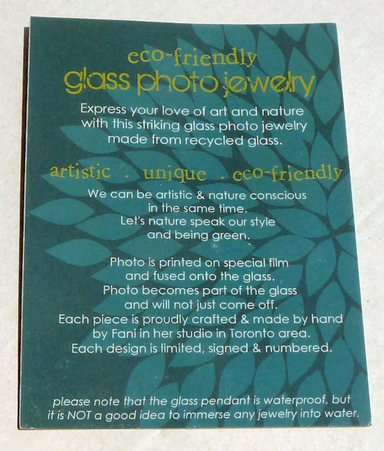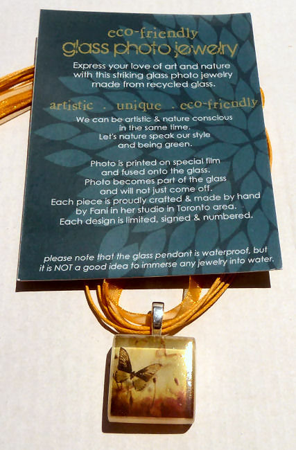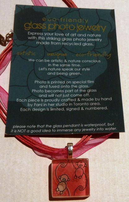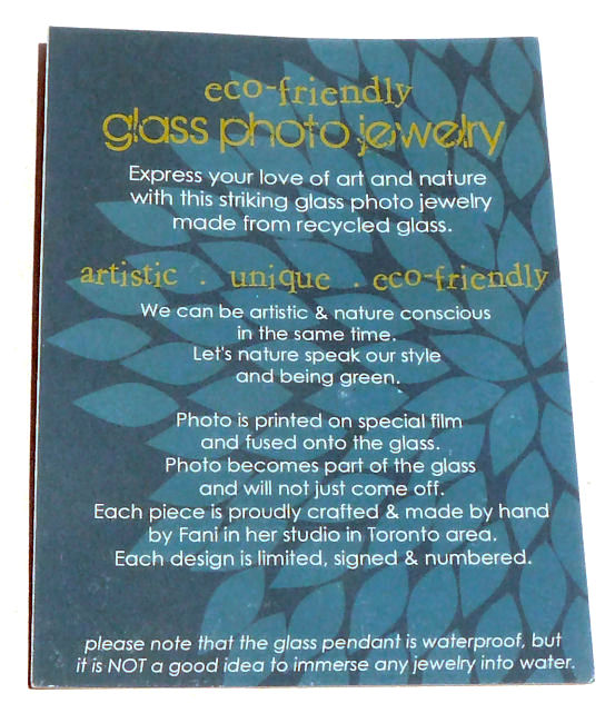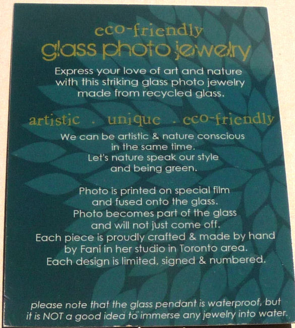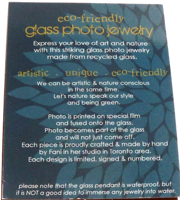 We loved Fani Song's beautiful handmade pendants created from 100% recycled glass and original photographs. They were such huge hits in our store that we were constantly reordering them. Her green and eco conscious glass pendants are handmade from unusable glass which is crushed into almost glass powder before being molded and re-fired in a glass kiln at a very high temperature. The original photo is printed on a special film which is then fused into the glass thus becoming a part of it and will never come off. It is then sealed with liquid glass.