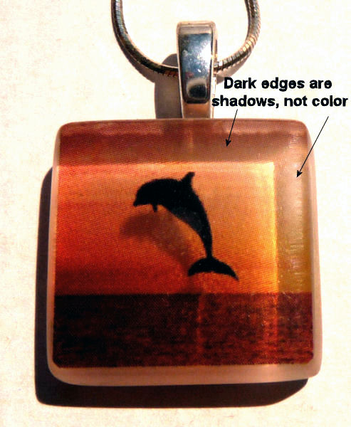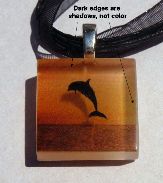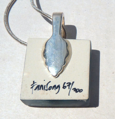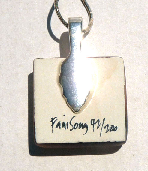 This pendant features a leaping black dolphin silhouetted in rich gold tones and is signed and numbered on the back (#42 of 200). Includes artist story card which explains the process on one side and the artist's statement on the reverse. It comes with an 18" sterling silver chain stamped 925 Italy. Pendant measures 7/8" square.