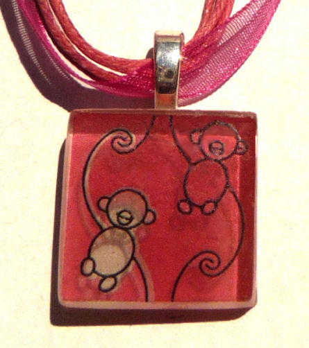 This pendant features monkeys on a pink background and is signed and numbered on the back (#32 of 200). Includes artist story card which explains the process on one side and the artist's statement on the reverse. It comes with an 18" pink ribbon cord.