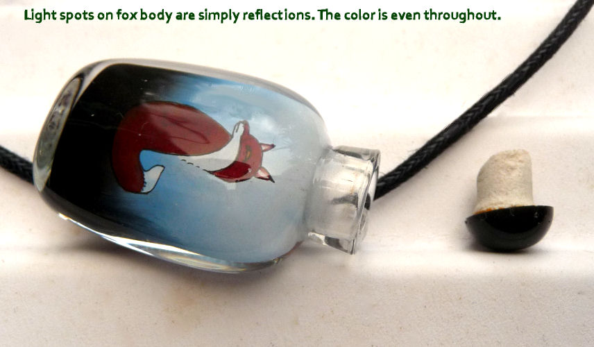 Victor Lee of Toronto, Canada, has been making enameled items for over 30 years. This delightful glass pendant bottle features a fox and rabbit motif reverse-painted on the inside and is entirely hand made ... great for carrying perfume with you. The glass bottle is hand blown and then hand drawn from within. The pendant is artist signed on the back side. Comes with a black cord (sterling chain is optional ... contact us for choices). Measures 1-1/2" long x 7/8" across.