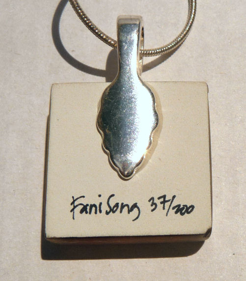 This whimsical "catfish" pendant was hand engraved and hand painted on hardwood by artist Victor Lee of Toronto, Canada. Victor is known for his enamel work on glass (see above) but diverted to a different medium to create this cute pendant. Comes with black cord. Measures 1-1/4" long x 1" wide.