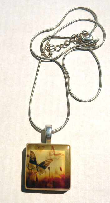 This pendant features butterflies in rich gold tones and is signed and numbered on the back (#37 of 200). Includes artist story card which explains the process on one side and the artist's statement on the reverse. It comes with an 18" adjustable sterling silver plated chain. Pendant measures 7/8" square.