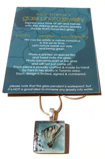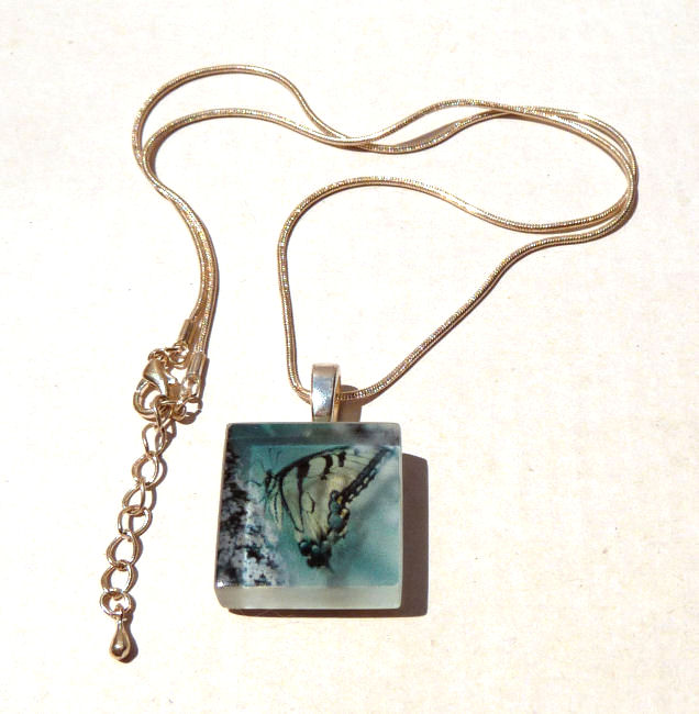 This pendant features a tiger swallowtail butterfly in blue tones and is signed and numbered on the back (#67 of 200). Includes artist story card which explains the process on one side and the artist's statement on the reverse. It comes with an 18" adjustable sterling silver plated chain. Pendant measures 7/8" square.