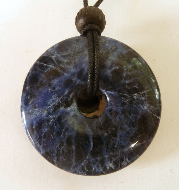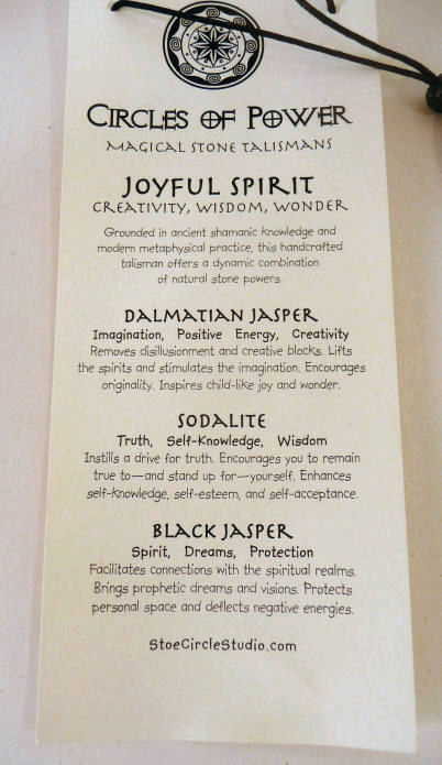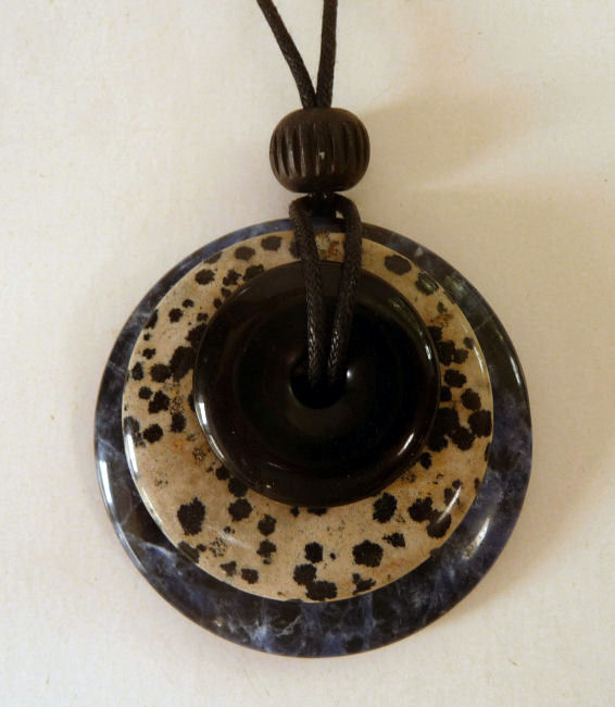 This necklace is "Joyful Spirit" and has -- in graduated sizes -- black jasper, dalmatian jasper, and sodalite stones. The largest stone in the stack measures 2" diameter and they are all polished smooth. Comes on a black cord with a bead which can be tied to different lengths.