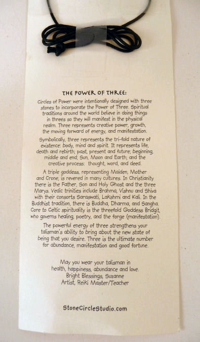 Suzanne Michell of Stone Cirlcle Studios has created these fabulous necklaces that combine the powers of the gemstones stacked together to infuse your spirit with life and energy! Each necklace comes with a story card describing the stones used and the powers they have. The back side of each card also tells about the Power of Three (hence the three stones) and the history and legend that surrounds it.
