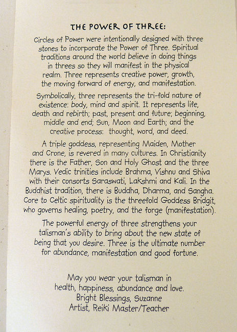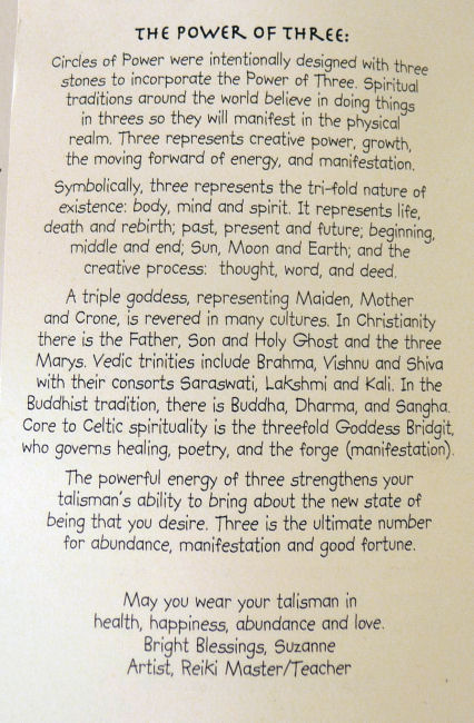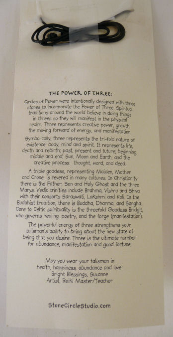 Suzanne Michell of Stone Cirlcle Studios has created this fabulous Magical Stone Talisman necklace that combines the powers of the gemstones stacked together to infuse your spirit with life and energy! Each necklace comes with a story card describing the stones used and the powers they have. The back side of each card also tells about the Power of Three (hence the three stones) and the history and legend that surrounds it.
