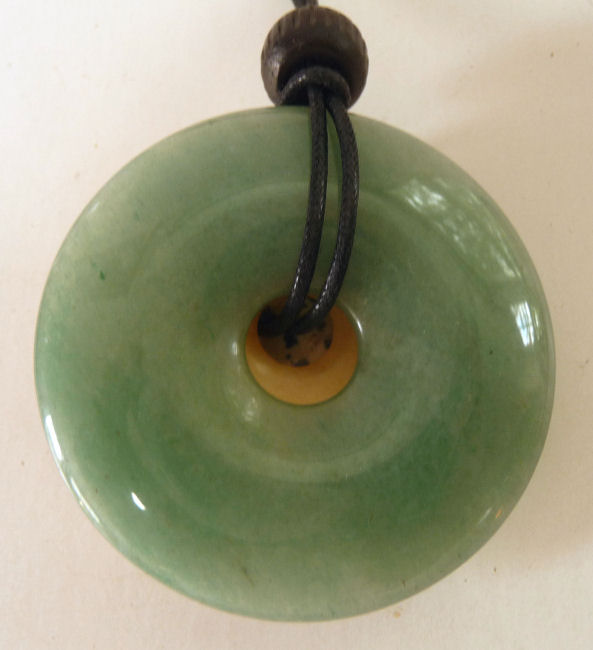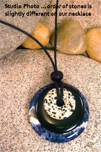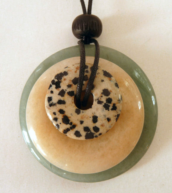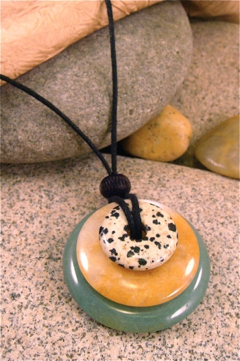 This necklace has -- from the top down -- dalmatian jasper, butterscotch jasper, and green aventurine stones. The largest stone in the stack measures 2" and they are all polished smooth. Comes on a black cord with a bead which can be tied to different lengths. Be sure to look at the photos and read the cards ... these make great gifts as well!