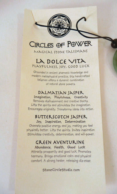 Suzanne Michell of Stone Cirlcle Studios has created these fabulous necklaces that combine the powers of the gemstones stacked together to infuse your spirit with life and energy! Each necklace comes with a story card describing the stones used and the powers they have.