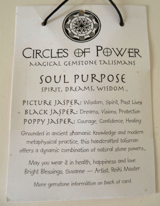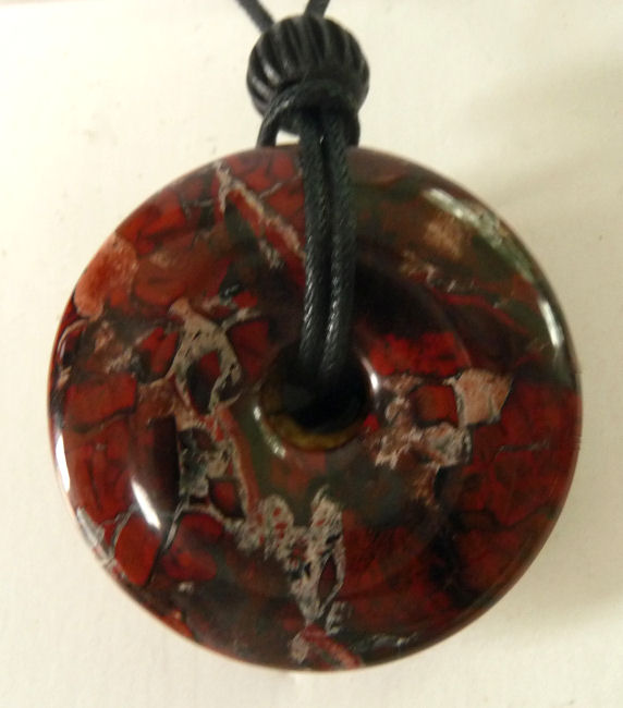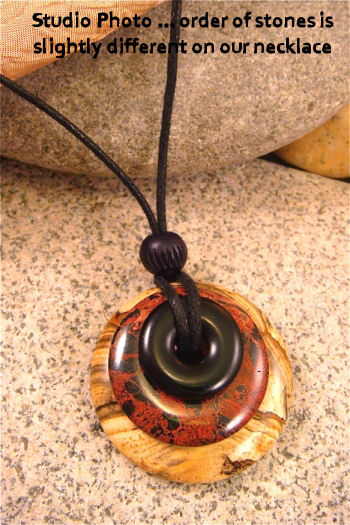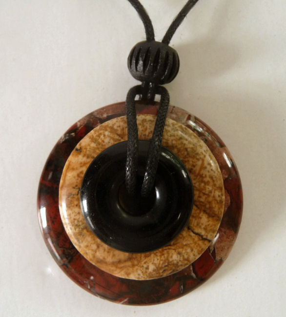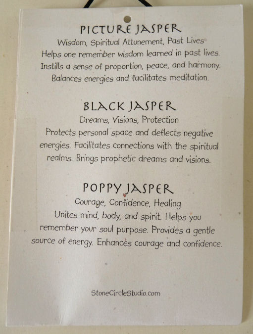 This necklace has -- from the top down -- black jasper, picture jasper, and poppy jasper stones. The largest stone in the stack measures 1-1/2" and they are all polished smooth. Comes on a black cord with a bead which can be tied to different lengths. Be sure to look at the photos and read the cards ... these make great gifts as well!