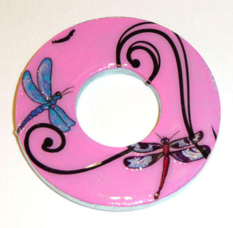 Just for fun, this pendant is done in pink enamel on a recycled washer from Habitats for Humanity with a pair of frolicking dragonflies and black swirls. Each pendant is hand enameled and created by Victoria Yater and comes with a cord for wearing. Measures 2 " diameter. Signed and dated on back by artist. Click here to see a short video showcasing her beautiful work.