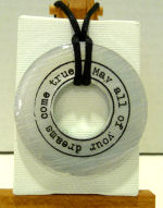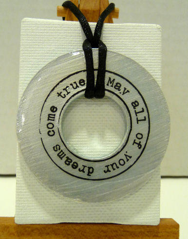 This pendant is made from a recycled washer from Habitats for Humanity and is handpainted and enameled by artist Victoria Yater. Pendant reads in a circle, "May all of your dreams come true." Each pendant comes on a coordinating cord to tie any length. Measures 2" diameter. Signed and dated on back by artist. Click here to see a short video showcasing her beautiful work.