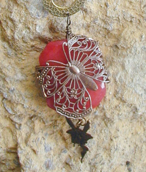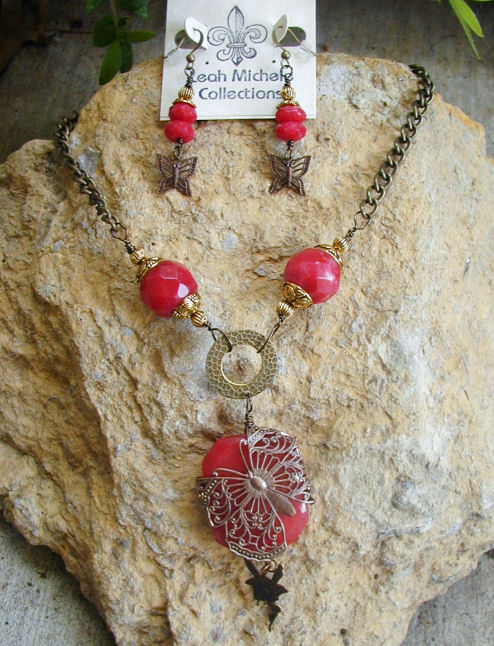 We are now carrying a line of beautiful gemstone jewelry created by Sheila Warren of Leah Michele Collections. Sheila is located in Oklahoma. This lovely necklace features a dragonfly of Vintaj Brass (also created in the U.S.) wrapped on ruby jade with ruby jade accent beads and a little antique brass fairy dangle at bottom. The matching earrings are for pierced ears and have Vintaj Brass butterfly dangles. Click on the photo for close-up images.