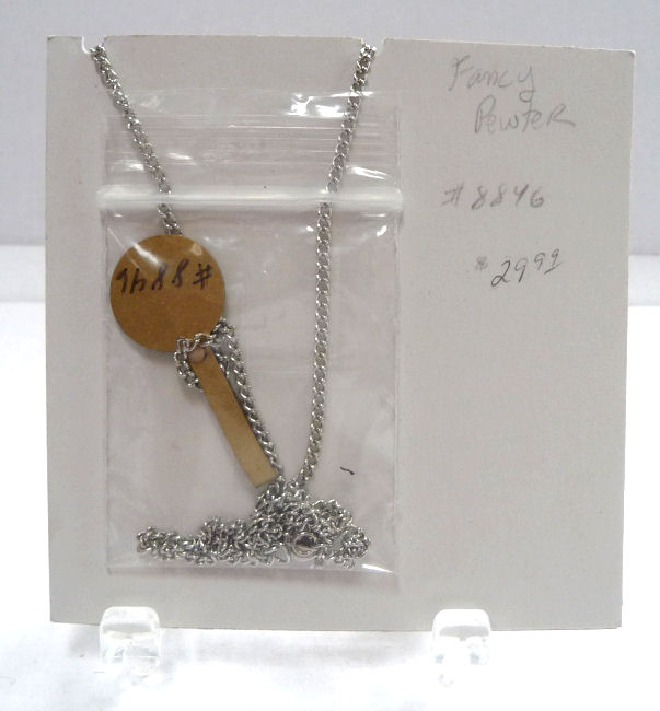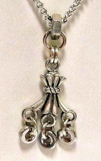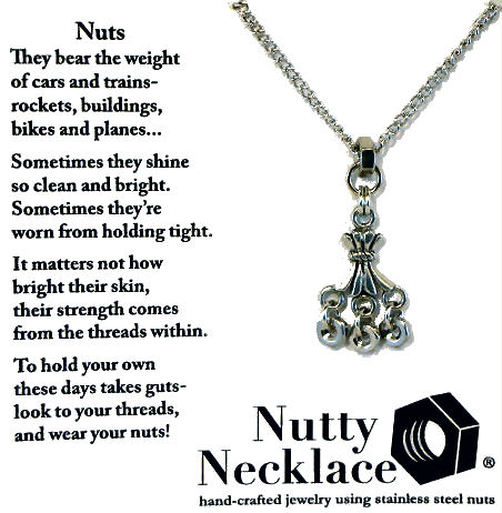 This cleverly designed necklace created by Shirley Myers of Nutty Necklace is made of polished stainless nuts suspended from a fancy pewter finding. No one would ever guess you were wearing hardware ... comes on an 18" stainless chain. what a great way to recycle! Comes mounted on a card featuring Shirley's own trademarked poem ... click on the photos to read it :-) Although Shirley's business is still going strong, this particular design is no longer available so it is truly one-of-a-kind!