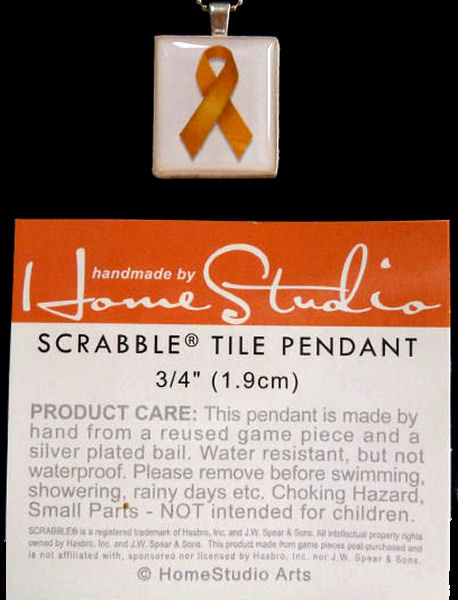 This wonderful awareness pendant bears the gold ribbon for childhood cancer and was handmade on a recycled Scrabble tile by Stef and Mark of HomeStudio Arts. What we had left has been packed away since 2010 and now is being offered ... this is the only one available. We have included a sterling silver chain. What a great way to show support for someone you love! ♥