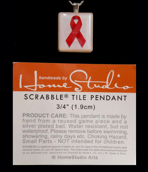 This wonderful awareness pendant bears the red ribbon for Aids and was handmade on a recycled Scrabble tile by Stef and Mark of HomeStudio Arts. These were a big seller in our store what we had left has been packed away since 2010 and now is being offered ... all we have left is what is being shown here. We have included a sterling silver chain. What a great way to show support for someone you love! ♥
