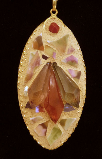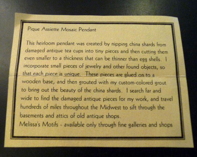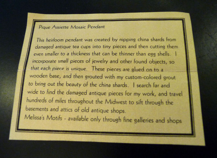 Featured in many magazines, Melissa Miller's pique assiette mosaic creations have been gracing fine restaurants and homes all across this country. When we had our store, we ordered several of her pendants which she no longer makes. We only have two left and this is one of them ... the other is a marquis shape listed below. All of her pieces are made of reclaimed shards of pottery, glass, china, and gemstones from old jewelry making each piece a truly unique work of art. With the pendant, which can be hung on a chain or ribbon, comes her statement of the technique. We hope you will find this as beautiful as we do!